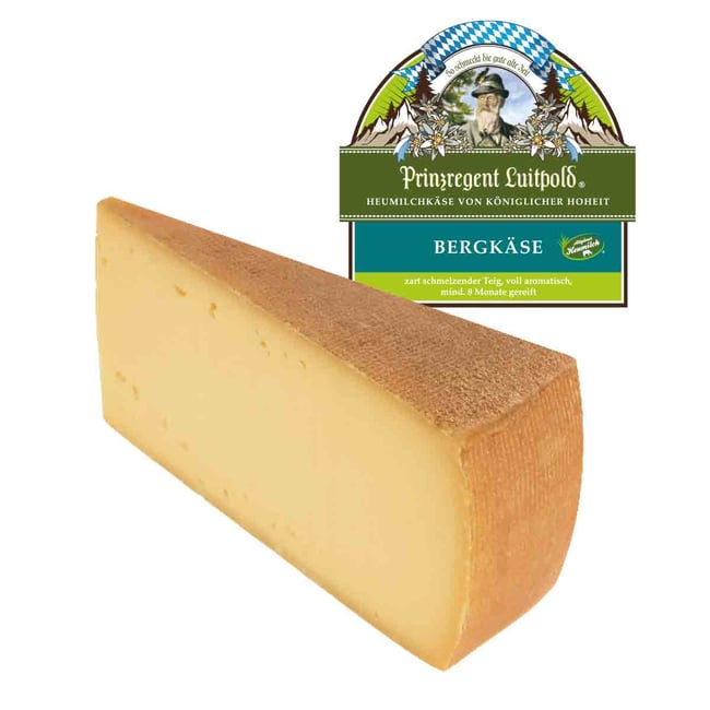 Der Prinzregent Luitpold Bergkäse ist der traditionsbewusste Hartkäse aus Allgäuer Rohmilch. Das Herzstück! Hier vereint sich das alte Käser-Handwerk durch die Reifung mit Rotschmierkulturen auf Fichtenbrettern in den hauseigenen Reifekellern. Dadurch entwickelt der Bergkäse seine voll aromatische Würze und erhält einen festen und dennoch zart schmelzenden Teig.