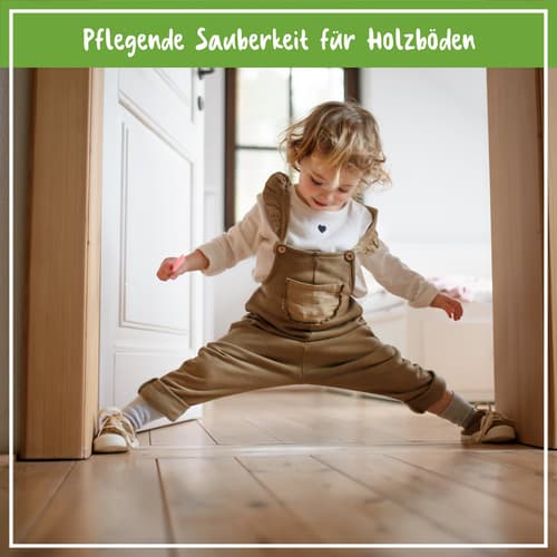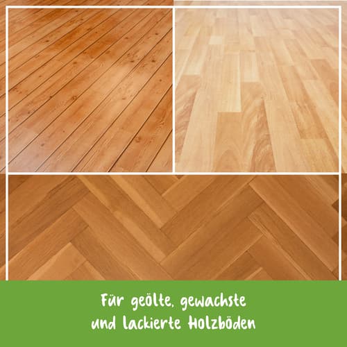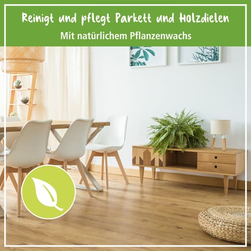 • Reinigt und pflegt Echtholzböden, wie Parkett und Dielen