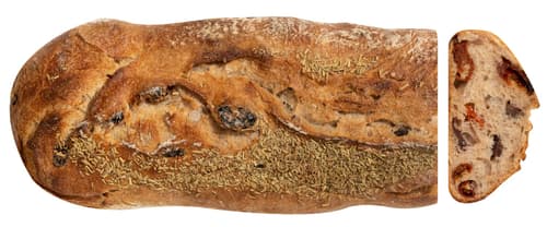 Weizenmehl*, Wasser, Weizen Vorteig* (Weizenmehl*, Wasser, Ur-Weizen Vollkornmalzmehl*, Salz), Roggenmehl, schwarze Kalamata Oliven*, halbgetrocknete Cherry Tomaten*, Ur-Roggen Vollkorn Sauerteig* (Waldstaudenroggen Vollkornmehl*, Wasser), Rosmarin*, Salz, Gerstentmalzmehl*