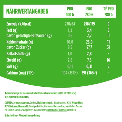 Zutaten: JOGHURTERZEUGNIS, Zucker, MOLKENERZEUGNIS, Oligofructose, 0,2% WEIZENKLEIE, 0,1% WEIZENVOLLKORNMEHL, flüssiges Pektin, Zitronensaftkonzentrat, natürliches Aroma. Mit Bifidus Kultur ActiRegularis®.
