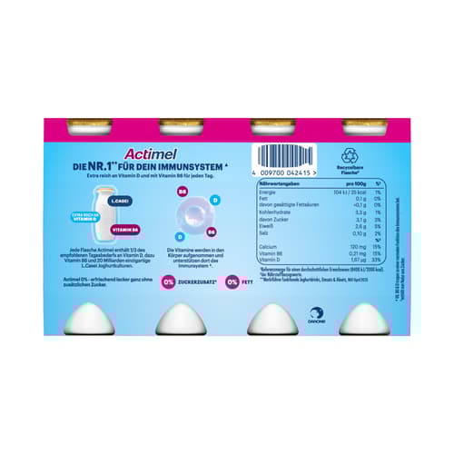 Actimel 0 % Multifrucht verzichtet auf künstliche Aromen, Konservierungsmittel oder Farbstoffe. Die Verpackung ist recycelbar – für deinen Genuss und weniger Müll.