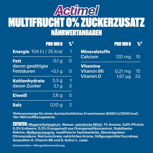 Zutaten: MAGERMILCHJOGHURT, Wasser, entrahmte MILCH, 1% Ananas, 0,6% Pfirsich, 0,3% Erdbeere, 0,3% Orangensaft aus Orangensaftkonzentrat, Stabilisator Pektine, MOLKENERZEUGNIS, modifizierte Stärke, Säureregulator Citronensäure, Natriumcitrate; natürliches Aroma, Süßungsmittel Sucralose, Acesulfam K; Vitamin B6 und D, Laktase, Kultur Lactobacillus casei.