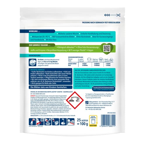 Dr. Beckmann Waschmittel-Blätter Sensitiv Baumwollblüte bieten mühelose Sauberkeit und einfache Handhabung. Die 100 % wasserlöslichen Blätter sind wirksam bei 20 - 95 °C und ideal für Kurzwaschgänge und Handwäsche. Mit Aloe Vera und berührungsaktivierbaren Duftkapseln für bis zu 7 Tage anhaltenden Duft. Geeignet für weiße und bunte Wäsche, biologisch abbaubar und vegan. Dr. Beckmann bietet seit 1971 professionelle und qualitativ hochwertige Spezialreiniger für verschiedene Haushaltsprobleme. Bekannt für seine Fleckenentferner, die über 150 verschiedene Fleckenarten beseitigen können, hat sich die Marke stark weiterentwickelt und ist heute in über 80 Ländern weltweit erhältlich. Dr. Beckmann hat mehrere Auszeichnungen erhalten, darunter Top Brand in Deutschland und Meist Innovatives Haushaltsprodukt im Vereinigten Königreich. Die breite Palette an spezialisierten Reinigungsprodukten, einschließlich Waschmittel-Blätter und WC-Reinigungs-Blätter, bietet innovative Lösungen für alle Reinigungsherausforderungen im Haushalt. Dr. Beckmann produziert seine Produkte mit einem hohen Maß an Nachhaltigkeit, einschließlich der Nutzung von Solarenergie und recyceltem Plastik. Produkte wie die Waschmittel-Blätter Sensitiv sind speziell für empfindliche Haut entwickelt. Die Philosophie der Marke basiert auf kontinuierlicher Forschung und Verbesserung, um die besten Reinigungslösungen zu bieten. Die delta pronatura GmbH wurde 1934 gegründet und hat ihren Hauptsitz in Egelsbach, Deutschland. Ursprünglich aus Schäfers Apotheke in Berlin stammend, wurde das Unternehmen von Gerhard Krauß übernommen. Heute wird es von den Geschäftsführern Nils Beckmann, Marco Buschmeier, Michael Klingel und Jan Zimpelmann geleitet. Nils Beckmann, Sohn von Heiner Beckmann, trat 2016 in die Geschäftsführung ein und übernahm 2024 die Leitung als CEO. Die delta pronatura GmbH ist in den Bereichen Wasch-, Pflege- und Reinigungsmittel tätig und hat Tochtergesellschaften in Österreich, der Schweiz, Frankreich, Mexiko, den USA und China sowie Joint Ventures in Großbritannien und Polen. Das Unternehmen erzielte 2022 einen Umsatz von 210 Millionen Euro und beschäftigte 480 Mitarbeiter im Jahr 2023. Seit 1982 vertreibt das Unternehmen Bullrich-Salz gegen Sodbrennen, eine der ältesten Marken Deutschlands. Produziert wird am Unternehmensstandort in Egelsbach, in Großbritannien bei Springdawn Bolton Ltd. und in Heppenheim bei Jacobi Pharma-Service GmbH & Co. KG. Die delta pronatura GmbH hat eine lange Geschichte der Innovation und hat sich zu einem globalen Akteur entwickelt. Seit 1973 vertreibt das Unternehmen in Lizenz eine US-amerikanische Lippenpflegemarke und seit 2011 ein Hautpflegeöl in Deutschland und Österreich.