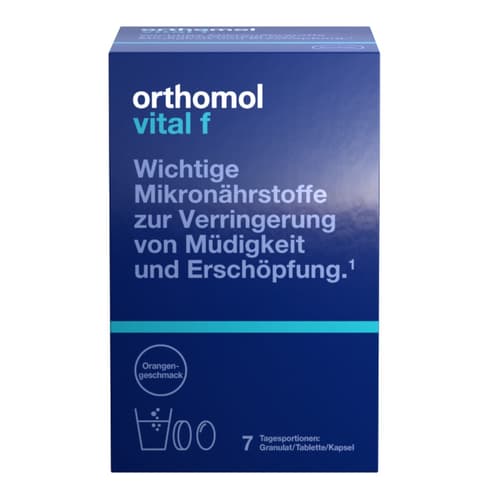 Orthomol Vital f für Frauen - bei Müdigkeit - mit B-Vitaminen, Omega-3-Fettsäuren und Magnesium - Orangen-Geschmack - Granulat/Tabletten/Kapseln, 7 St. Tagesportionen
