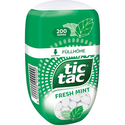 Der Frische-Klassiker. tic tac fresh mint ist minzig, vanillig und erfrischend. Die köstlichen Dragees mit dem Geschmack milder Carmagnola-Minze sorgen im Handumdrehen für ein frisches Durchatmen. Darin sind die Kleinen nämlich ganz groß und bei gerade mal 2 Kalorien pro Stück in der handlichen Spenderdose ein treuer Begleiter für alle Fälle. Kühl und Trocken aufbewahren
