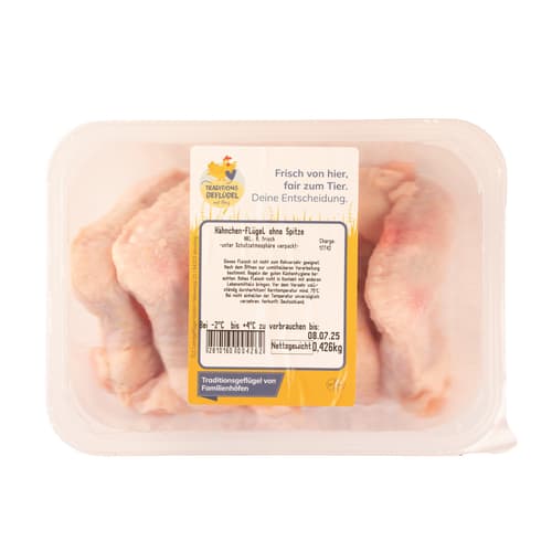 Diese Hähnchenflügel von Traditionsgeflügel werden ohne die Flügelspitze angeboten. Sie bestehen aus dem fleischreichen Mittelstück und dem Schulterteil und eignen sich gut zum Grillen oder Braten.