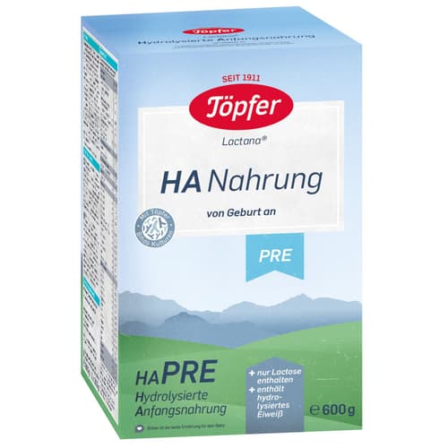 Die Töpfer HA Pre ist als alleinige Nahrung oder zusätzlich zum Stillen geeignet. Die Töpfer HA Pre enthält DHA - gesetzlich für Säuglingsnahrung vorgeschrieben, sowie die wichtigen langkettigen, mehrfach ungesättigten Fettsäuren (Omega-3 und Omega-6).