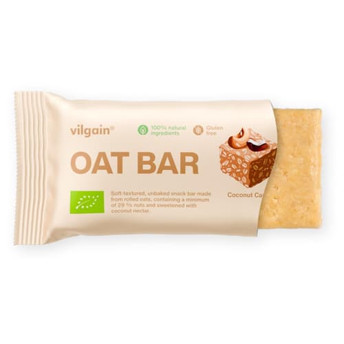 Der Vilgain Oat Bar BIO Cashew und Kokos ist ein Riegel, der auf der Basis von glutenfreien Haferflocken, Cashewkernen und Kokosnuss hergestellt wird. Er zeichnet sich durch seine weiche, leicht zerfallende Textur aus, die ein angenehmes Kaugefühl bietet. Die Süße stammt ausschließlich aus Datteln und Agavendicksaft, wodurch auf Zuckerzusatz verzichtet wird. Dieser Riegel ist eine schnelle Quelle für komplexe Kohlenhydrate und eignet sich als Snack für zwischendurch.
