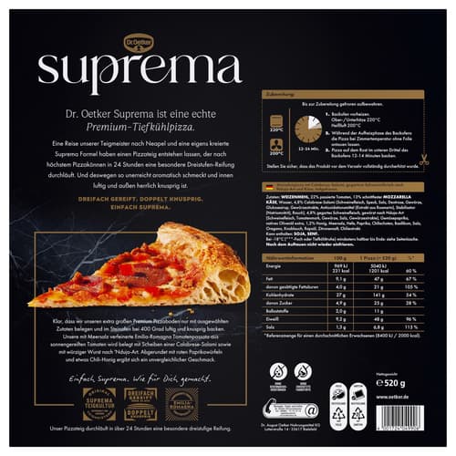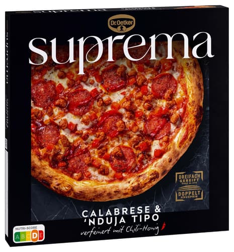 Zutaten: WEIZENMEHL, 22% passierte Tomaten, 13% schnittfester MOZZARELLA KÄSE, Wasser, 4,8% Calabrese-Salami (Schweinefleisch, Speck, Salz, Dextrose, Gewürze, Glukosesirup, Gewürzextrakte, Antioxidationsmittel (Extrakt aus Rosmarin), Stabilisator (Natriumnitrit), Rauch), 4,8% gegartes Schweinefleisch, gewürzt nach Nduja-Art (Schweinefleisch, Tomatenpüree, Gewürze, Salz, Gewürzextrakte), Gemüsepaprika, Olivenöl nativ extra, 1,2% Honig, Meersalz, Hefe, Paprika, Chilischoten, Basilikum, Salz, Oregano, Knoblauch, Rapsöl, Zitronensaft, Chiliextrakt. Kann enthalten: SOJA, SENF.