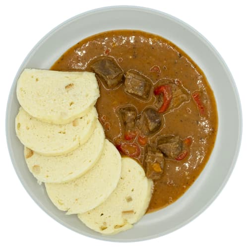 Zutaten: Sauce 57% [Trinkwasser, Zwiebel, Weizenmehl, sterilisierte rote Paprika (Paprika, Trinkwasser, Alkoholessig, Zucker, Salz), Rapsöl, Peperoni, Salz, süße Paprika, Vmasox [Salz, Zucker, Hefeextrakt, Maismaltodextrin, Geschmacksverstärker: E621, E631, E627; Aromen (enthält Sellerie), Palm- und Rapsöl, Rindfleischextrakt 2% (Salz, Rinderjerky 0,94%, Rapsöl), Trockengemüse (Zwiebel, Petersilie), Gewürzmischung (Muskatblüte, gemahlener schwarzer Pfeffer), Farbstoff Curcumin], Knoblauch, Majoran, gemahlener Kümmel, gemahlener schwarzer Pfeffer], Semmelknödel 32% [Weizenmehl, Semmel 9% (Weizenmehl, Rapsöl, Salz, Hefe, Zucker, Backtriebmittel (Gerstenmalzmehl, Weizenmehl, Emulgator: E472e; Enzyme: Hydrolasen; Backtriebmittel: E170; Mehlverbesserer: E300), Trinkwasser, Hefe, Salz, pasteurisierte Eimelange], Rindfleisch 11%.