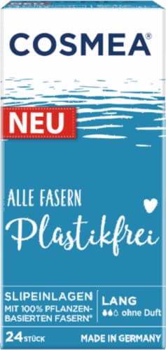 "Unsere plastikfreien COSMEA® Slipeinlagen Normal enthalten dank intensiver Entwicklungsarbeit keine Kunstfasern mehr! Die atmungsaktiven Einlagen bestehen ausschließlich aus Naturfasern – für ein nachhaltig gutes Gefühl.