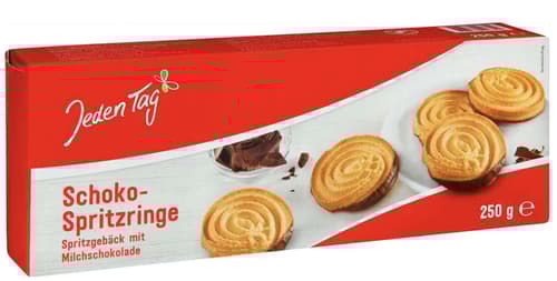Die Jeden Tag Schoko-Spritzringe sind zarte Mürbegebäckringe, die zur Hälfte mit einer kakaohaltigen Glasur überzogen sind. Sie zeichnen sich durch ihre buttrige, mürbe Konsistenz und die charakteristische Form aus, die durch Spritzen des Teiges entsteht. Die Kombination aus dem feinen Keksgeschmack und der süßen Schokoladennote macht sie zu einem beliebten Gebäck. Als Produkt der Eigenmarke "Jeden Tag" bieten diese Spritzringe eine preisgünstige Option für einen klassischen Gebäckgenuss. Sie sind ideal als Begleiter zu Kaffee und Tee oder als kleine Süßigkeit für zwischendurch.