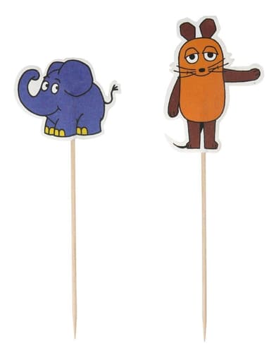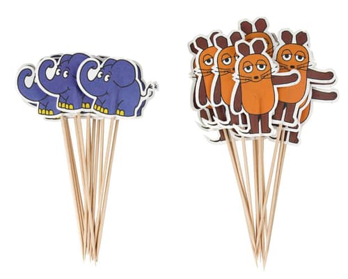 Party-Picker "Maus & Elefant", je 12 St. , DieMaus, Motiv: Papier, Picker: Birken-Holz, Maus 17x5cm, Elefant 14x5 cm, 24-tlg. , je 12 Picker mit Maus- und Elefanten-Design, zum festlichen Dekorieren von Torten, Kuchen & Cupcakes, Bunt
