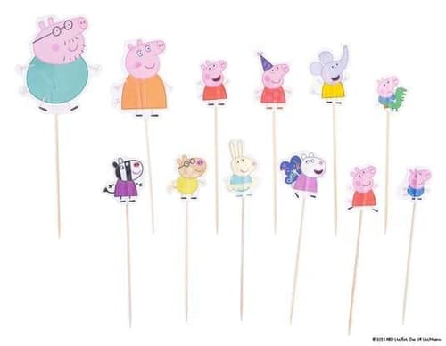 Papier Party-Picker "Peppa, Freunde & Familie", 24 tlg. , Peppa Pig, Picker: Birkenholz, FSC™ Mix, Motiv: Papier, FSC™ Mix, 24tlg. , Perfekt zum Verzieren von Muffins, Cup Cakes & Co. , Motive: je 2x 3 verschiedene Peppa-Designs, je 2x 2 verschiedene Schorsch-Designs, je 2x Mama Pig, Papa Pig, Zoe Zebra, Pedro Pony, Emily Elefant, Klausi Kläff, Luzie Locke; je inkl. 10cm Holzpicker, bunt