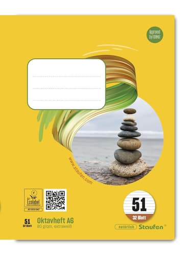 Das Oktavheft von Staufen im DIN A6-Format hat Lineatur 51 (liniert, ohne Rand) und besteht aus 32 Blättern 80 g/m²-Papier. Es eignet sich für Notizen und kurze Einträge.