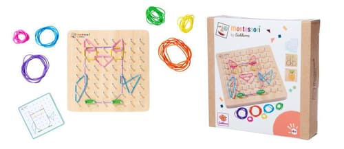 - Stabiles Holzbrett mit Gummibändern zum Legen von Formen und Mustern.