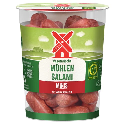 Die Rügenwalder Mühle Vegetarische Mühlen Salami Minis sind kleine, vegetarische Snackwürstchen in Salami-Art. Sie eignen sich für unterwegs, als Snack zwischendurch oder als Ergänzung zur Brotzeit.