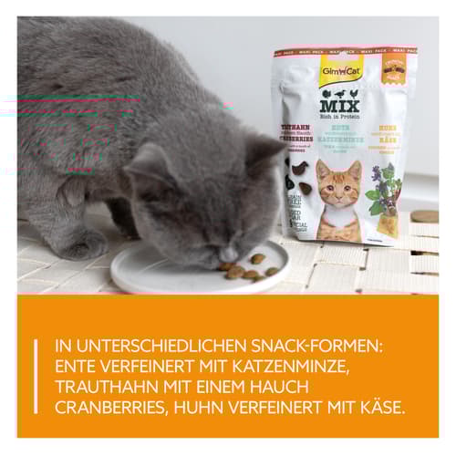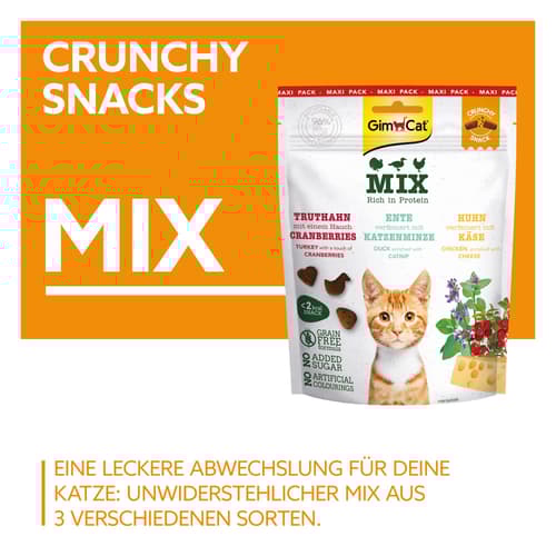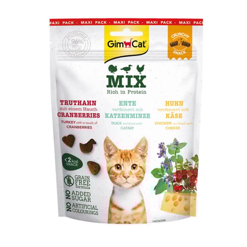 Das Mix Pack enthält drei Sorten knuspriger Snacks in einem praktischen Beutel. Die Leckerlis eignen sich für Katzen aller Rassen.