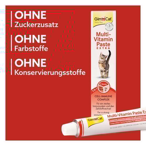 Die Multi-Vitamin Paste Extra enthält 12 Vitamine, Beta-Glucan und Öle zur Unterstützung des Immunsystems. Sie ist für Katzen aller Altersstufen geeignet.