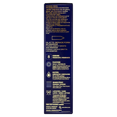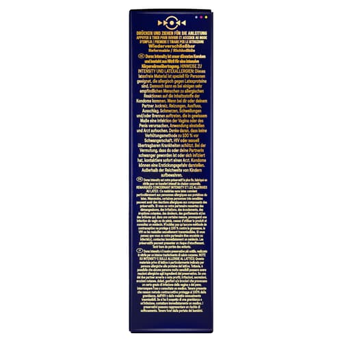 Die latexfreien Durex Intensity Kondome sind unsere dünnsten Kondome (ultra dünn plus) und aus Nitril gefertigt – für eine intensive Körperwärmeübertragung und das Gefühl, nur deinen Partner zu spüren. Durch die Befeuchtung mit viel Silikongleitgel wird der Sex für euch noch angenehmer. Die Kondome sind transparent, haben eine gerade Form und eine nominale Breite von 56 mm (reguläre Passform). Damit ihr auch immer gut geschützt seid, ist es wichtig, die richtige Kondomgröße zu verwenden. Ein zu großes Kondom kann abrutschen, ein zu kleines Kondom kann platzen. Jeder Mensch ist anders, aber ein Kondom sollte für alle stets bequem und sicher sein. 100 % aller Durex Kondome sind elektronisch geprüft. Zudem durchläuft jede Charge fünf Qualitätstests. Damit du das Kondom gleich richtig herum aus der Folie nimmst und überziehen kannst, halte die Folie beim Öffnen mit dem Durex Logo nach unten.