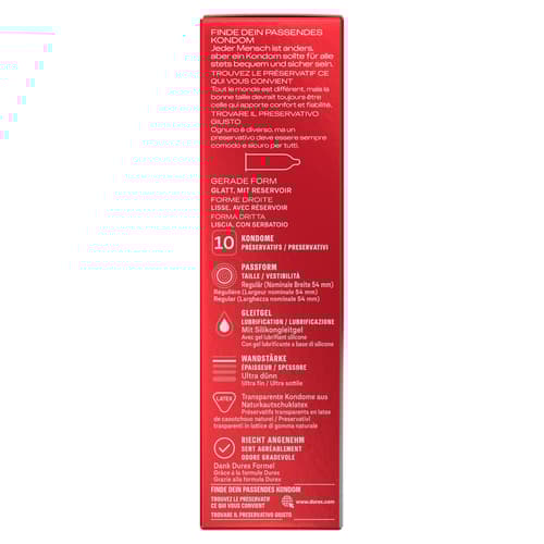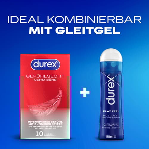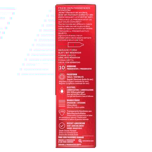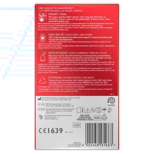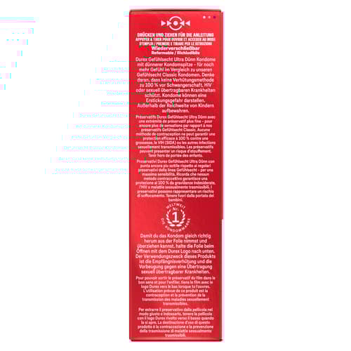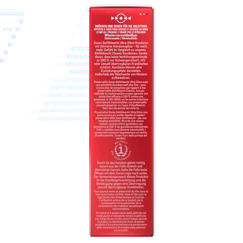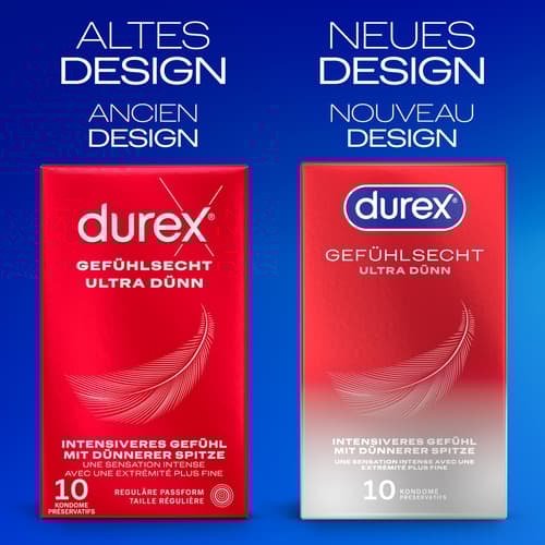 Jetzt mit neuem Verpackungsdesign! Die Durex Gefühlsecht Ultra Kondome sind an der Spitze noch dünner – für noch mehr Gefühl im Vergleich zu unseren Gefühlsecht Classic Kondomen. Sie haben eine nominale Breite von 54 mm (reguläre Passform) und sind mit Silikongleitgel befeuchtet – so wird der Sex für euch noch angenehmer. Die glatte, gerade Form mit Reservoir sorgt für einen komfortablen Sitz. Dank der neuen Formel mit speziellen Inhaltsstoffen riechen die Kondome außerdem angenehm. Damit ihr auch immer gut geschützt seid, ist es wichtig, die richtige Kondomgröße zu verwenden. Ein zu großes Kondom kann abrutschen, ein zu kleines Kondom kann platzen. Denn jeder Mensch ist anders, aber ein Kondom sollte für alle stets bequem und sicher sein. Durex Kondome durchlaufen 5 Qualitätstests und sind dermatologisch getestet. Zudem ist jedes einzelne Kondom zu 100 % elektronisch geprüft. Sofort startklar: Wir sorgen dafür, dass jedes Kondom in jeder einzelnen Folie immer gleich herum liegt. Dabei dient das Durex Logo auf der Folie als Orientierung. Damit du das Kondom gleich richtig herum aus der Folie nimmst und überziehen kannst, halte die Folie beim Öffnen mit dem Durex Logo nach unten. RICHTIG GUTER SEX FÜR ALLE Wir stehen für echten Sex. Egal, auf was ihr steht – wir möchten, dass ihr euch damit gut fühlt. Wir glauben daran, Probleme zu erkennen und kämpfen dafür, sie zu lösen. Sex, der sich gut anfühlt – und gut tut.