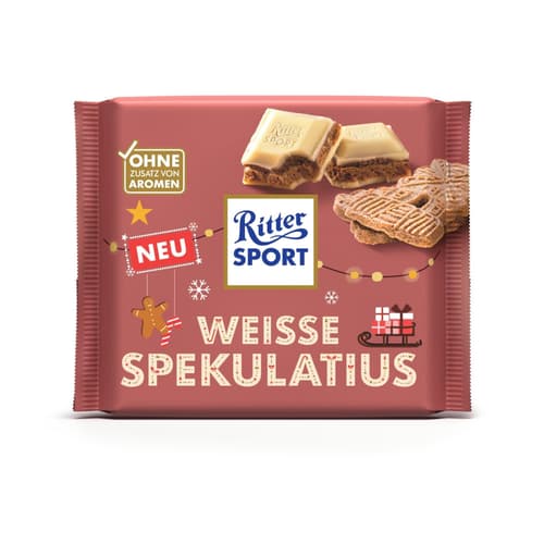 Die Ritter Sport Weisse Spekulatius ist eine saisonale Winterkreation, die den Geschmack der Weihnachtszeit in eine quadratische Form bringt. Sie besteht aus feiner weißer Schokolade, die eine Füllung aus winterlich gewürzter Kakaocreme und knusprigen Spekulatius-Stückchen umschließt. Diese Schokolade vereint die Cremigkeit der weißen Schokolade mit dem festlichen Aroma des traditionellen Spekulatiusgebäcks, wodurch sie ein besonderes Geschmackserlebnis bietet.