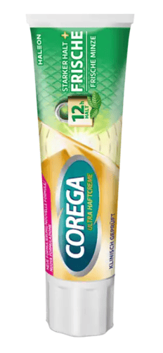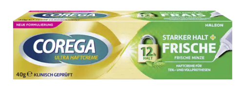 Die COREGA Ultra Haftcreme sorgt für sicheren Halt von Zahnprothesen und ein frisches Mundgefühl. Sie ist geschmacksneutral und leicht aufzutragen.