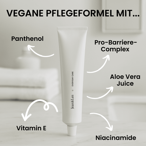 3,5% Pro-Barriere-Complex Schützt Deine Haut vor äußeren Einflüssen. 5,5% Niacinamide + Vitamin EFördert die Hauterneuerung und hilft Trockenheitsfältchen zu mildern. 10,6% Aloe Vera Juice* + Panthenol Spendet Deiner Haut Feuchtigkeit und schützt sie vor dem Austrocknen. *Gewonnen aus Aloe Vera Saft Konzentrat.