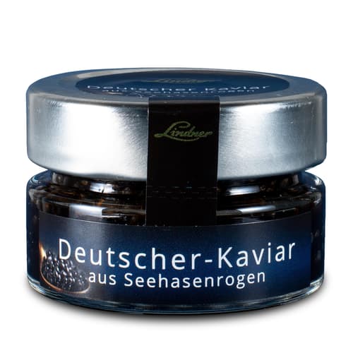 Dieser deutsche Kaviar besticht durch seine milde Salznote und feine, schwarze Körnung. Hergestellt aus hochwertigem Seehasenrogen, bietet er einen festen Biss und ein harmonisches, leicht salziges Aroma. Durch seine ausgewogene Würze bleibt der natürliche Geschmack des Seehasenrogen erhalten und unterstreicht das feine Profil dieses Kaviars.