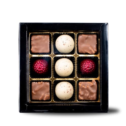 Jeder Trüffel ist ein kleines Meisterwerk: Mandelsplitter und eine Schicht aus rotem Zucker sorgen für eine angenehm knusprige Textur, die im Kontrast zur cremigen Füllung steht. Die Verwendung von Kakaobutter, Vollmilchpulver und Sahne verleiht den Trüffeln einen unvergleichlich samtigen Schmelz.