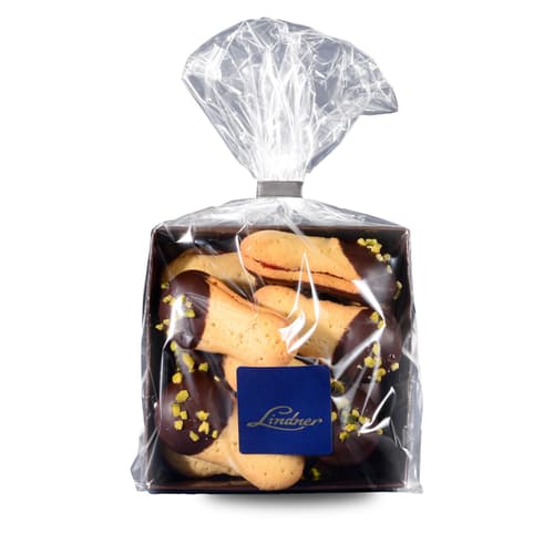 Die Pistazienzungen vereinen meisterhafte Backkunst und erlesene Zutaten in einem köstlichen Gebäck. Ein feiner Buttermürbeteig bildet die Basis, die mit fruchtiger Aprikosen-Erdbeer-Konfitüre gefüllt ist. Auf einer Seite mit dunkler Zartbitter-Kuvertüre überzogen und mit gehackten Pistazien bestreut, entsteht eine harmonische Kombination aus fruchtigem Geschmack, edler Schokolade und nussigem Aroma.