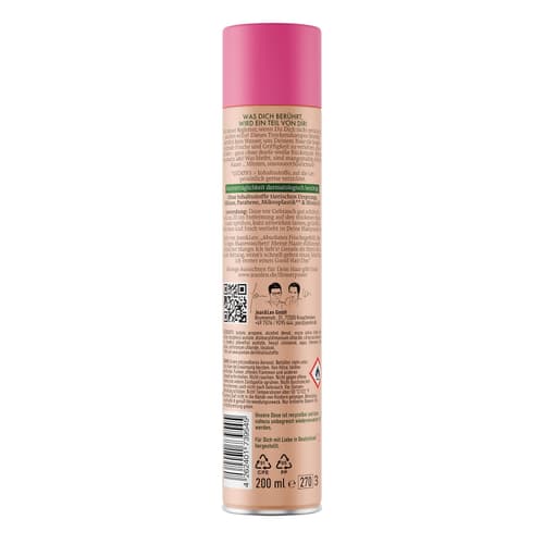 Ingredients: butane, propane, alcohol denat., oryza sativa (rice) starch, parfum, tocopheryl acetate, distearyldimonium chloride, citrus aurantium peel oil, dimethyl phenethyl acetate, hexyl cinnamal, aqua, limonene, linalyl acetate, cetrimonium chloride, linalool.