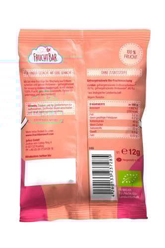 Ich bin eine fruchtige Bio-Mischung aus Erdbeerscheiben und ganzen Himbeeren - gefriergetrocknet für knusprig - leichten Knabberspaß. In mir stecken 100% Frucht, ganz ohne Zusatzstoffe. Perfekt für unterwegs und zwischendurch!