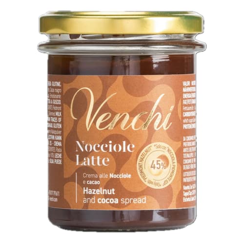 Piemonteser HASELNUSSkernpaste 45%, Zucker, Magerkakaopulver 9%, MagerMILCHpulver, Kakaobutter, Emulgator (SOJAlecithin), Kann Spuren enthalten von (andere Schalenfrüchte