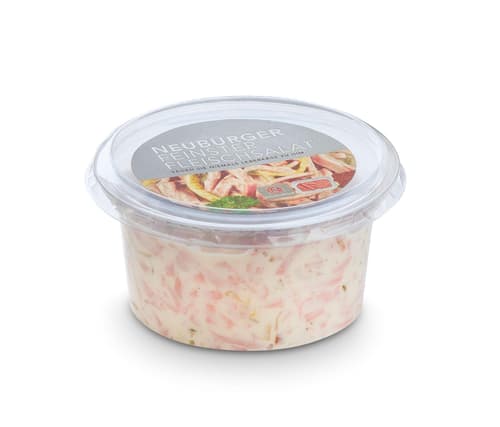 Zutaten: 44% Neuburger-Brätwurst (28% Rind- und Schweinefleisch, Wasser, Speck, Speisesalz, Stabilisator: E450; Dextrose, Geschmacksverstärker: E621; Antioxidationsmittel: E300; Gewürze, Gewürzextrakte, Knoblauch, Konservierungsstoff: E250), 44% Salat-Mayonnaise (Rapsöl, Wasser, Weingeistessig (DE: Branntweinessig), Zucker, EIGELB,
