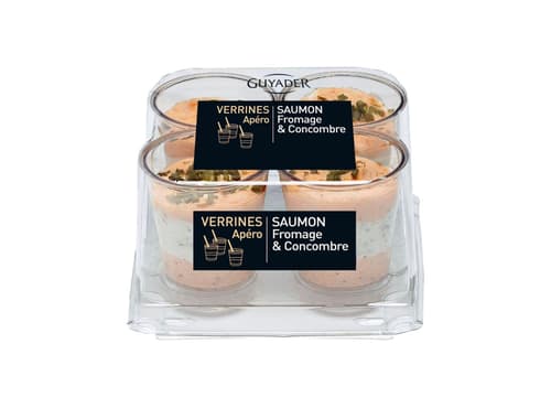 herstellt aus 18,5% Lachs, 3% Räucherlachs, 14,5% Frischkäse, 9,5% grüner Gurke, verfeinert mit Minze, Zwiebeln, Petersilie, und Dill, gewürzt mit Salz und Knoblauch, geschichtet in transparenten Kunststoffbechern, 4x40g Becher auf einem Kunststofftray