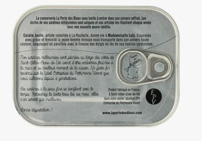 2.Cans of sardines, vintage 2023 x Mademoiselle Lulu 115G. Ingredients : Fresh sardines, extra virgin olive oil, salt. NUTRITIONAL VALUES : (AVERAGE PER 100 g): Energy Value 790 kj / 223 kcal - Fats 16 g of which: saturated fatty acids 4.3 g - Carbohydrates <0.5g of which: sugars <0.5g - Proteins 23g - Salt 0.69g. Keep refrigerated after opening for a maximum of 48 hours.