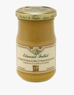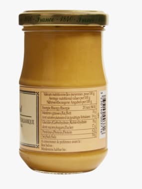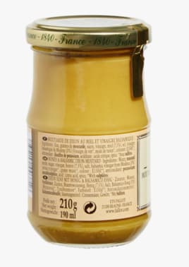 3.Honey & balsamic dijon mustard 210G. Ingredients : Water, mustard seeds, sugar, vinegar, honey (7,5%), salt, balsamic vinegar from Modena (3%) (wine vinegar*, grape must* colour : E150d, antioxidant : potassium metabisulphite, acid : citric acid, spice. *With sulphites. NUTRITIONAL VALUES : (AVERAGE PER 100 g): Energy Value 840 kj / 201 kcal - Fats 10 g of which: saturated fatty acids 0.6 g - Carbohydrates 18g of which: sugars 17g - Proteins 6.2g - Salt 5.8g. Store in a cool, dark place, then refrigerate after opening.