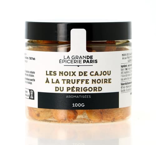 4.Cashew nuts with Périgord black truffle flavoured 100G. Ingredients : Cashew nuts 91% (Origin : Vietnam), flavours, egg white, freeze-dried black truffle [Tuber melanosporum Vitt.] 0.25%* (Origin : France), salt. *Equivalent to 1% fresh truffle. May contain traces of gluten, peanuts, soya, other nuts, mustard, sesame, sulphites. NUTRITIONAL VALUES : (AVERAGE PER 100 g): Energy Value 2114 kj / 487 kcal - Fats 40 g of which: saturated fatty acids 8.9 g - Carbohydrates 30g of which: sugars 4.6g - Proteins 17g - Salt 1.31g. Store at room temperature and in a dry place. Close after use.