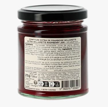 6.Extra willamette raspberry jam 215G. Ingredients : Willamette raspberries, cane sugar, gelling agent : pectins, concentrated lemon juice. NUTRITIONAL VALUES : (AVERAGE PER 100 g): Energy Value 970 kj / 229 kcal - Fats 0.2 g of which: saturated fatty acids 0g - Carbohydrates 54g of which: sugars 54g - Proteins 0.7g - Salt 0g. Refrigerate (10days after opening).