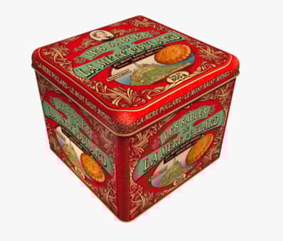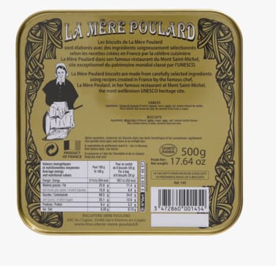 5.Large shortbread box 500G. Ingredients : wheat flour (France), butter, sugar, eggs, salt, natural vanilla flavour. May contain traces of soya, sesame seed and nuts. NUTRITIONAL VALUES : (AVERAGE PER 100 g): Energy Value 2114 kj / 504 kcal - Fats 22.8 g of which: saturated fatty acids 15.9 g - Carbohydrates 69.5g of which: sugars 25.1g - Proteins 6.4g - Salt 0.25g. Use quickly once open and store in an airlight box.
