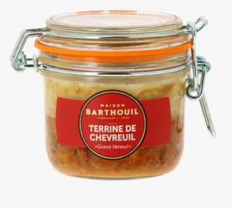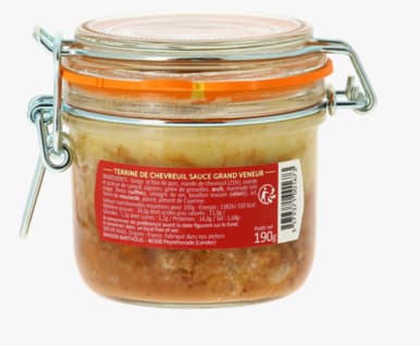 1.Venison terrine with grand veneur sauce 190G. Ingredients : Pork throat and liver, venison (25%), duck meat and fat, onions, redcurrant jelly, eggs, marinade (red wine, port (sulfites), wine vinegar, homemade stock (celery)), salt, mustard flour, pepper, cayenne pepper. NUTRITIONAL VALUES : (AVERAGE PER 100 g): Energy Value 1382 kj / 330 kcal - Fats 30 g of which: saturated fatty acids 11 g - Carbohydrates 1.2g of which: sugars 1.2g - Proteins 14g - Salt 1.68g. Keep in a cool and dry place.