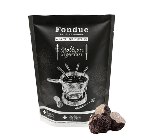 Das Moléson Fondue Signature Trüffel basiert auf der bewährten Signature‑Mischung (z. B. mit gereiftem Gruyère AOP und Vacherin Fribourgeois) und enthält zusätzlich **Sommertrüffel (Tuber aestivum)** – typischerweise bis zu rund 3 % – für dezente, erdige Noten.