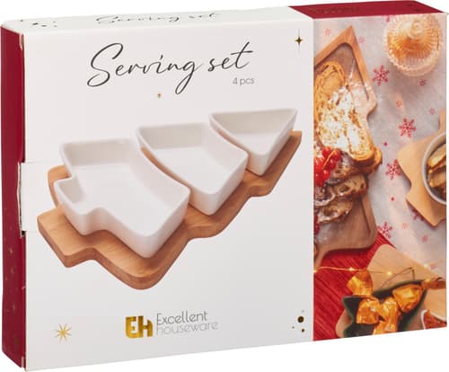 Das Servierset besteht aus drei Schalen und einem Holzbrett in Form eines Weihnachtsbaums. Es eignet sich zum Anrichten von Snacks, Süßigkeiten oder Gebäck in der Advents- und Weihnachtszeit.
