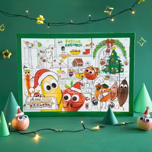 Und das ist nocht nicht alles! Auf den Rückseiten der Schachteln wartet ein spannendes Weihnachtsbäckerei-Suchspiel mit Alfred Apfel & Co.. Wer täglich umdreht, rätselt mit – und deckt nach und nach ein großes, verstecktes Bild auf. So wird das tägliche Schachtel-Öffnen zum fruchtig-frechen Vorweihnachtszeit-Ritual – mit allem, was dazu gehört: Snacken, Suchen und Staunen!