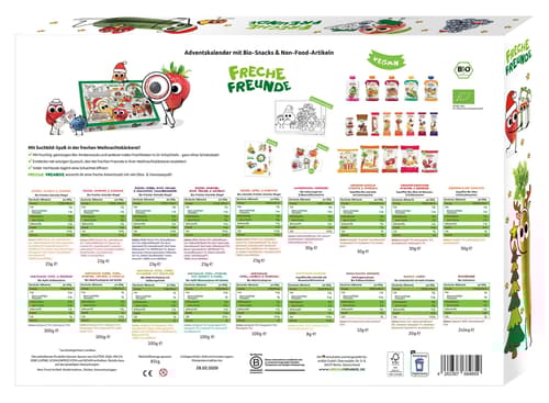 Hinter den 24 liebevoll gestalteten Schachteln verstecken sich fruchtig-gemüsige Bio-Kindersnacks und andere freche Highlights – ganz ohne Schokolade, dafür mit jeder Menge Spaß.