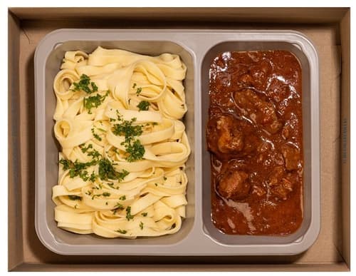 Dazu gibt’s hochwertige Tagliatelle, die perfekt zur kräftigen Sauce passen – al dente gekocht, brauchst du sie nur noch zu erwärmen. Alles kommt fix und fertig zu dir – für einen Abend, der nach Italien schmeckt.
