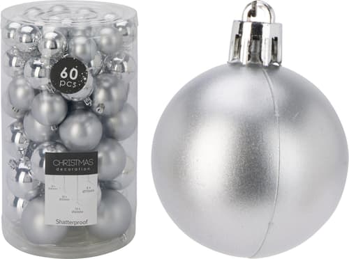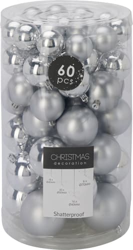 Dieses Set enthält 60 silberfarbene Weihnachtskugeln. Sie eignen sich ideal zur Dekoration von Weihnachtsbäumen und für festliche Arrangements.