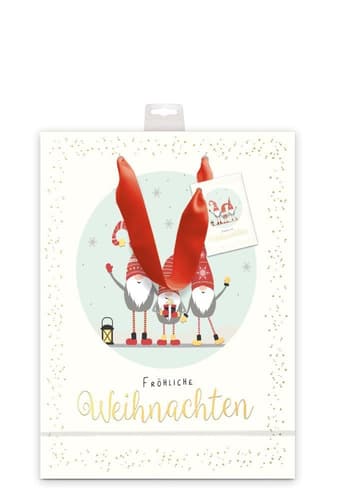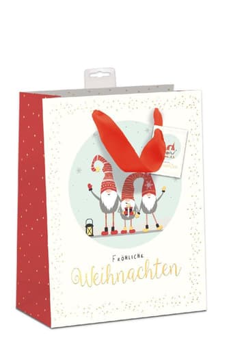 Die Geschenktasche Wichtel im Format 26 × 32 × 12 cm bietet ausreichend Platz für mittelgroße Geschenke. Sie besteht aus Papier und ist mit einem weihnachtlichen Wichtelmotiv bedruckt.