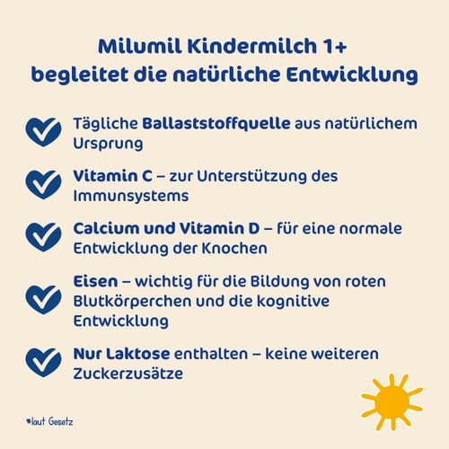 Dein kleiner Entdecker lernt gerade so viele neue Dinge! In dieser aufregenden Phase kann Milumil Kindermilch 1+ als Teil einer abwechslungsreichen und ausgewogenen Ernährung helfen, dein Kleinkind mit einer guten Portion der für diesen Entwicklungsschritt doch so wichtigen Nährstoffe zu versorgen. Unsere Milumil Kindermilchen wurden von Ernährungsexperten entwickelt und versorgen dein Kleinkind mit wichtigen Vitaminen und Mineralstoffen.